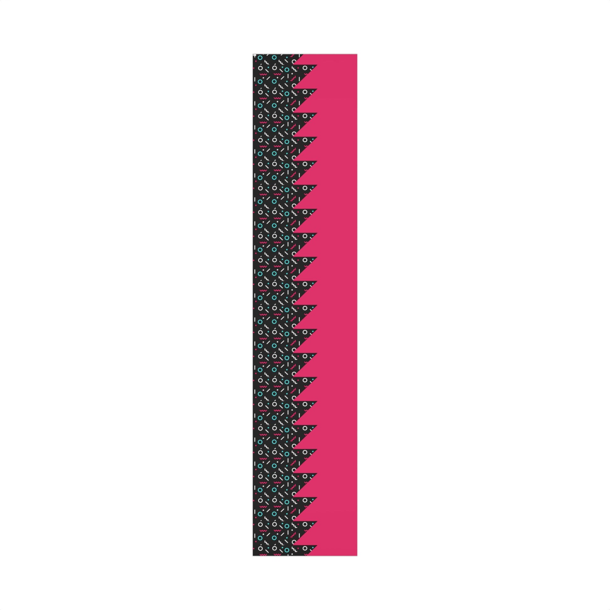 Bright, playful gift wrap that brings a burst of 80s-inspired energy to every present. A bold hot-pink field is balanced by a black geometric stripe filled with tiny confetti shapes, rings, and zigzags — a look that reads retro party and modern design at once. The paper lays smoothly around boxes, resists small scuffs and water, and folds cleanly without cracking, so your ribbons and tags sit neat and crisp. Printed with water-based GreenGuard UL certified inks on 100% paper and available in satin or matte finishes, these sheets feel cheerful and thoughtful when giving to friends who love color, nostalgia, and a little graphic edge.